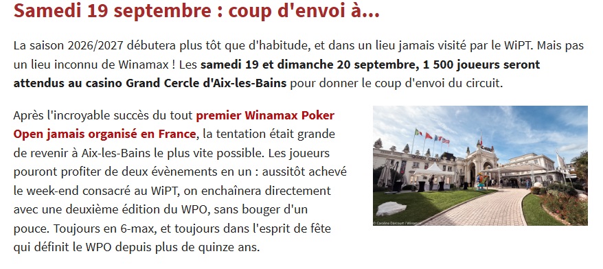 WINAMAX POKER OPEN AIX-LES-BAINS - 2e édition du 22 au 27 septembre 2026